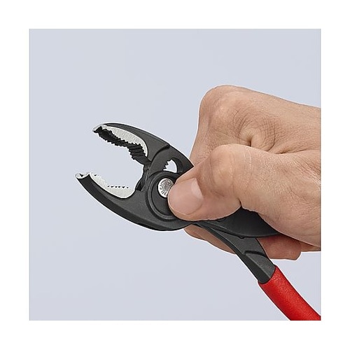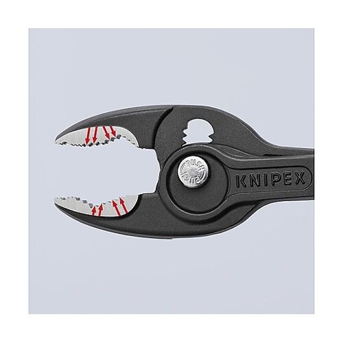 5段階のプッシュボタン調整機構です。ピンチガードで指の挟みこみを防止します。頑丈なボックスジョイント機構による耐久性と弾力性があります。誘導硬化処理を施されたアゴの硬度は約61HRCです。頭部やネジ山 |