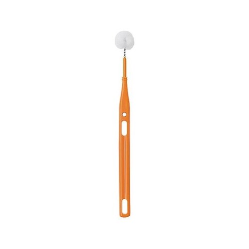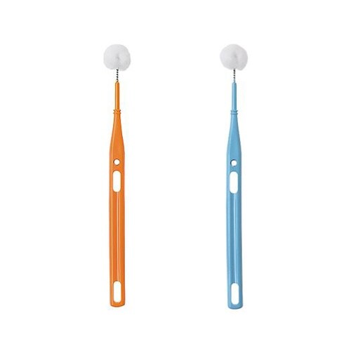 綿毛のようなソフトな感触なので、過敏な口腔粘膜の清掃も安心して行えます。全周が毛の球面ブラシなので、食物残渣や痰、舌苔などの汚れを絡め取ることができます。 |