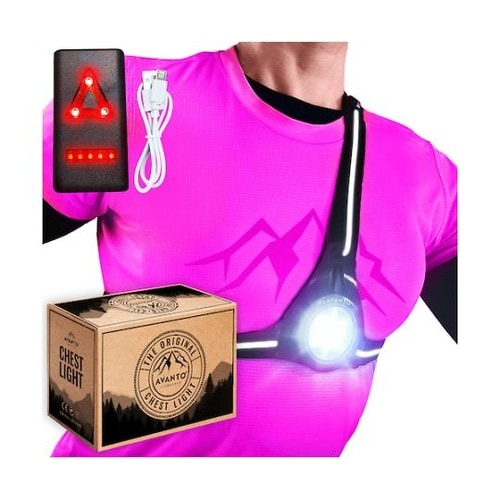 背後の赤色ライトによって遠方からでも高い視認性があります。胸元でON/OFFや明るさの切り替えが簡単に可能です締め付きすぎによるストレスが少ないです。明るさを2段階で切り替えることが可能です。着用中に |