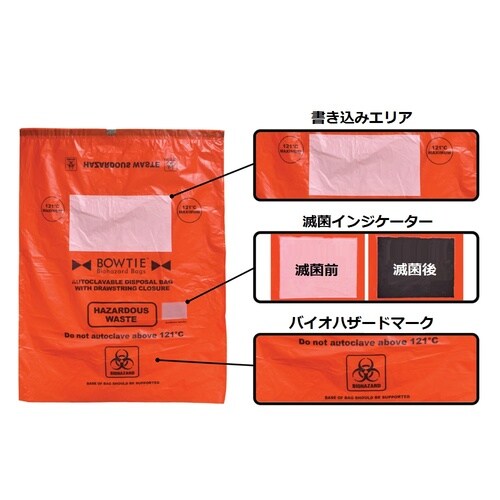 バッグの口には紐が通してあり、簡単に口を閉じることができます。滅菌インジケーター付きで、色変化で未使用か使用済みかを判断できます(白→黒)。表面にはメモ欄として利用できる大きな白い書き込みエリア、バイ |