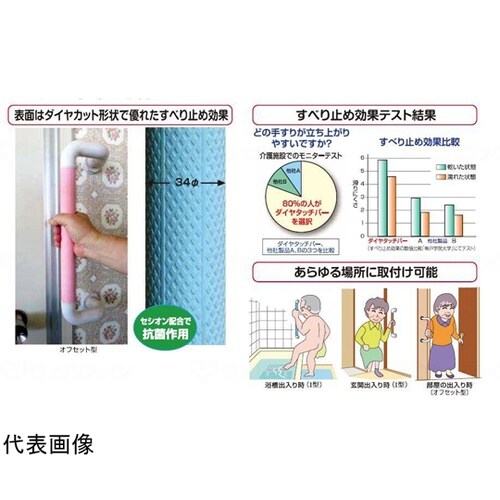 すべり止め効果抜群のゴム製手すりダイヤカットのゴム表面が握力の弱い高齢者の方でもしっかりと握れ、立ち座りや移動が大変楽になります。表面はダイヤカット形状で優れたすべり止め効果セシオン配合で抗菌作用あら |
