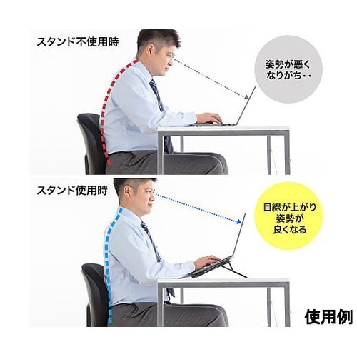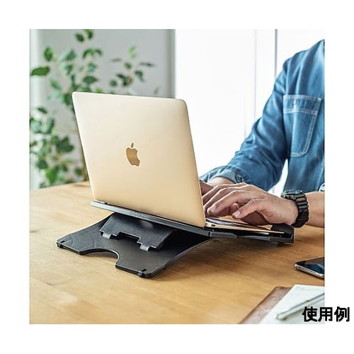 3段階で角度調節できる折りたたみノートパソコンスタンド。角度をつけることで目線を上げて適切な姿勢を保つことができます。タブレットの角度調整用スタンドとしても便利です。折りたたみ式で持ち運びに便利です。 |