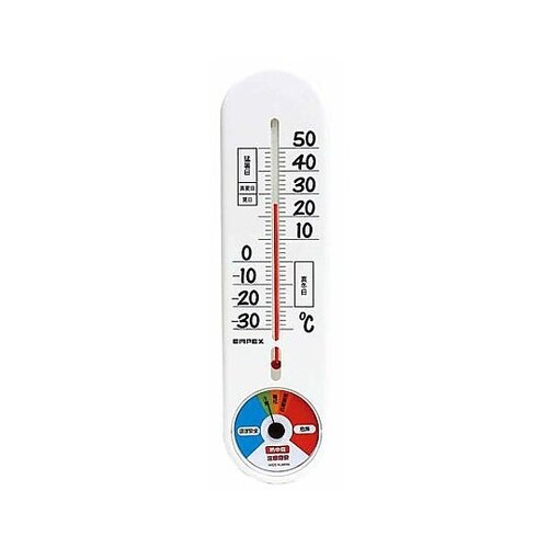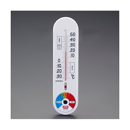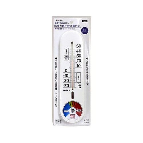 壁掛用高温多湿になることで指針が動きレベルが上がる5段階の熱中症注意目安(WBGT参考値)と夏日、真夏日、猛暑日、真冬日ゾーンがついたガラス管温度計の一体型です。電池不要、操作不要で設置をするだけで計 |