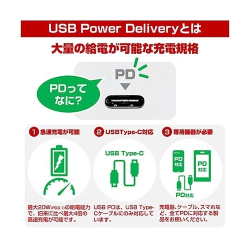 AC差込口USBポートノートパソコンやタブレットと一緒に持ち運べるコンパクトサイズ。スマートフォン、タブレット等を超速充電できるPD(パワーデリバリー)対応!最大20Wまでの給電が可能。※USB Ty |
