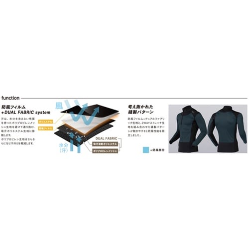 風を打ち砕け!汗冷え軽減機能付き、防風コンプレッションウェア。体温を風から守る、ストレッチ防風ハイネックシャツ。防風フィルム+DUAL FABRIC system:汗は、水分を含まない性質を持ったポリ |