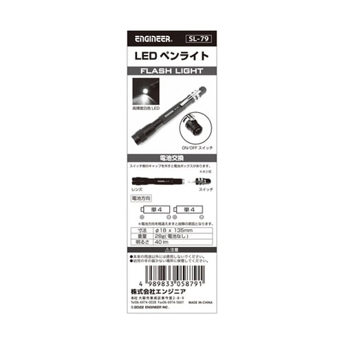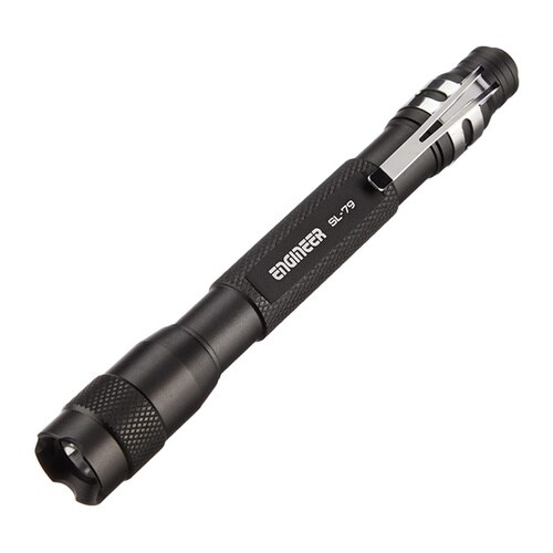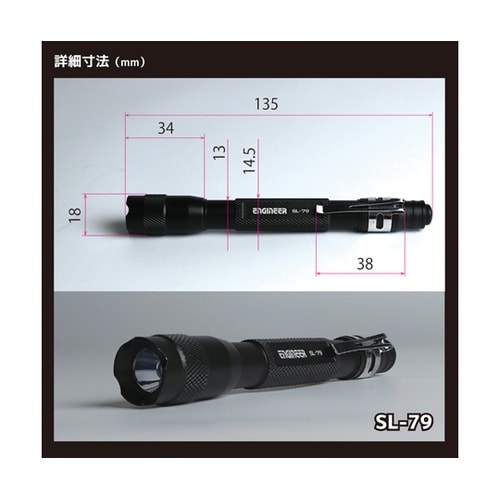 携帯に便利なクリップ付きです。ON/OFFスイッチでライトのオンオフがワンタッチです。暗所での作業などに。 |