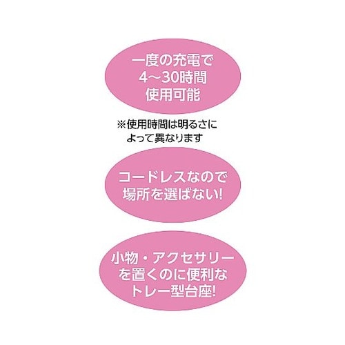 自然光に近いライトがやさしく照らしてくれるのでメイクがしやすい!コードレスなので場所を選ばない!LED・ミラー部の角度調節可能小物・アクセサリーを置くのに便利なトレー型台座!一度の充電で4−30時間使 |