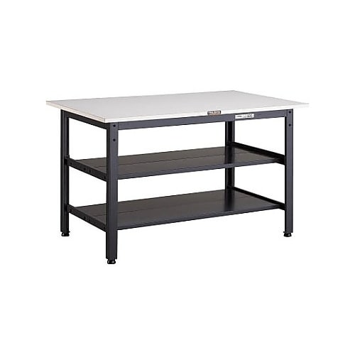 下棚を2段設置し、作業台下のスペースを有効活用できます。中棚は30mmピッチで7段階調整できます。主要部が溶接構造のため強度の優れた作業台です。 |