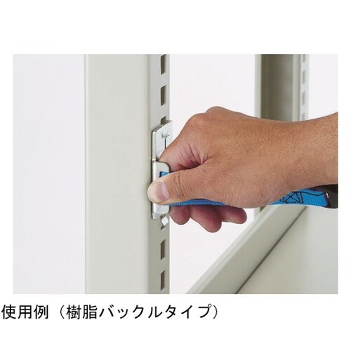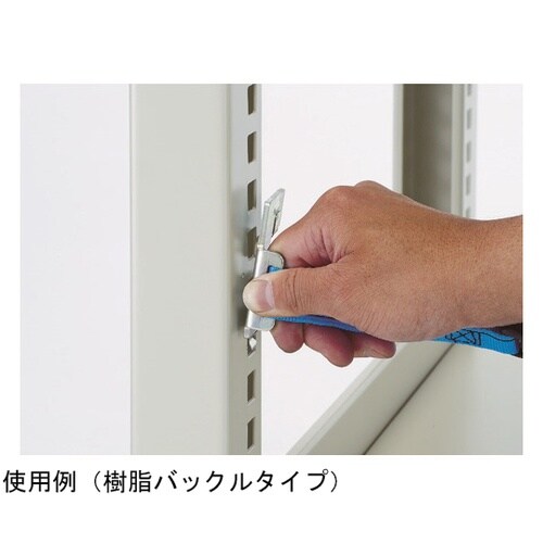 支柱のスリットに差し込むだけで取り付けができる落下防止ベルトです。破断強度はセンターバックル100kg、樹脂バックルは90kgです。棚に積載した収納物の落下防止に。