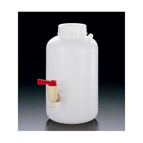 石灰水の沈殿瓶に最適なポリ瓶ひも穴付き中栓付きコック付き※指定位置への取付けも承ります。 |