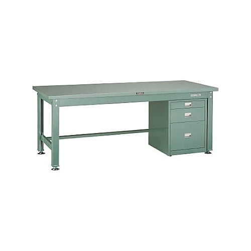 引出しが3段あるサイドキャビネット付です。サイドキャビネットにはキャスターがついています。耐久性に優れています。脚部はグリーン色です。スチール天板を使用し、汚れがひと拭きでとれ、割れや傷への耐久性に優 |