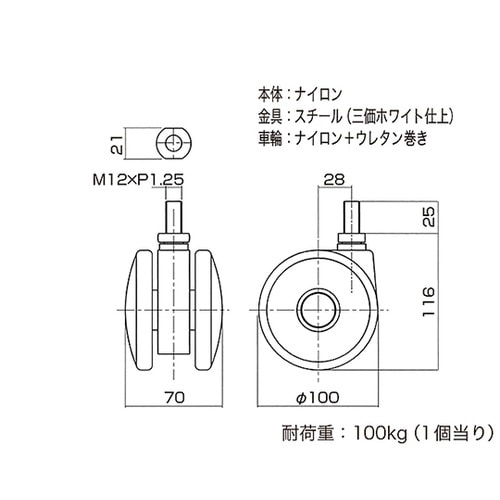 ハイロジック Tシリーズキャスター 100mm M12ボルト・ストップ付 A054-8702
