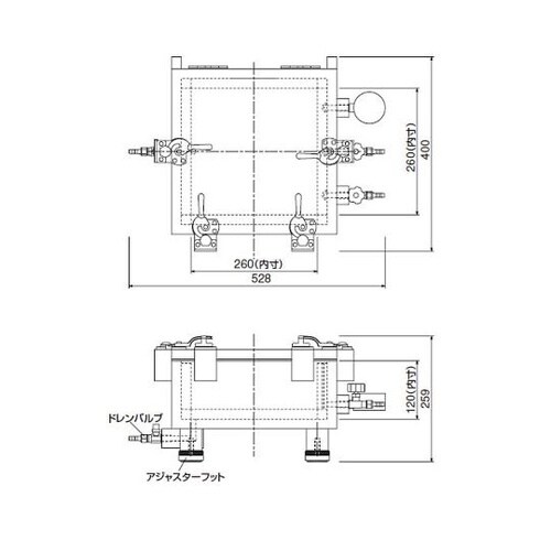パッケージテストにも応用可能なアクリル製の真空デシケーター底部にドレン用の排水用バルブと、高さ調整アジャスターを標準装備し、簡易に排水が可能 |