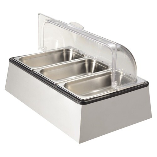 スタイリッシュなのにとってもリーズナブル。ステンレスGNパン1/3×60mm 3枚使用安全面を考慮して低出力のヒーターを採用しているのでウォーターパンには水ではなく熱湯を表示のラインまで注いでご使用下 |
