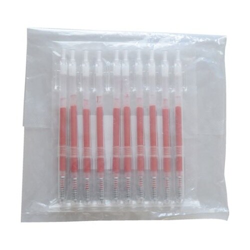 クリーン環境下で梱包し、γ線で滅菌処理しています。透明軸のため、インク残量が見やすいです。キャップ紛失の心配がないノック式です。 |