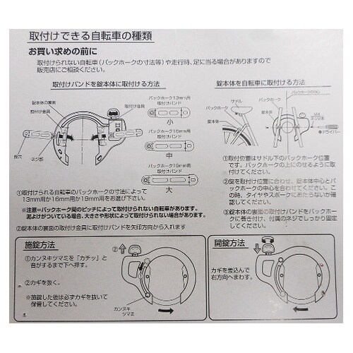 軽快車から子供車まで幅広く対応できるリング錠です。フレームサイズに合わせて選べる3種類の取付金具付です。 |