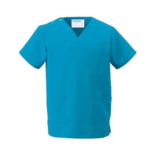 幅広いシーンに対応する15色の高機能スクラブ着脱しやすいスナップボタン仕様下を向いても中が見えにくい開きの浅いV衿。袖から脇が見えにくいセットインスリープ。内側(ネーム)部分にカラーテープ付。
