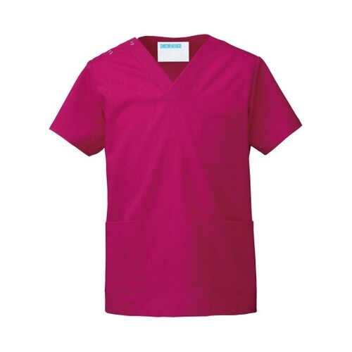 幅広いシーンに対応する15色の高機能スクラブ着脱しやすいスナップボタン仕様下を向いても中が見えにくい開きの浅いV衿。袖から脇が見えにくいセットインスリープ。内側(ネーム)部分にカラーテープ付。