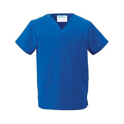 幅広いシーンに対応する15色の高機能スクラブ着脱しやすいスナップボタン仕様下を向いても中が見えにくい開きの浅いV衿。袖から脇が見えにくいセットインスリープ。内側(ネーム)部分にカラーテープ付。