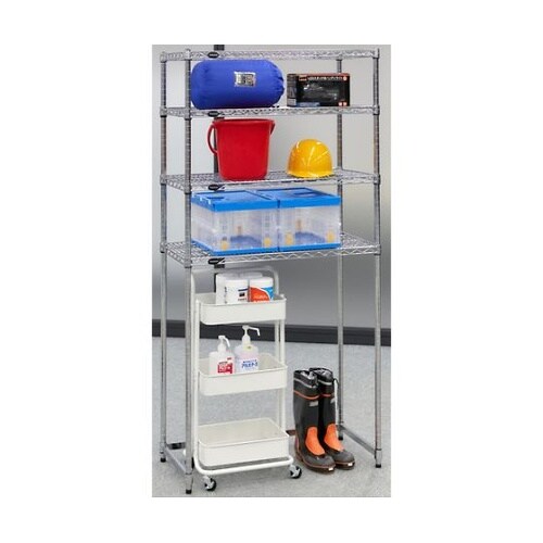 下の段を無くしたことによりワゴンや台車などの収納に便利で、かつ上部を有効に使えます。三層メッキ構造で防錆力抜群です。アジャスターは+15mmの調整ができるので水平出しも簡単です。各種倉庫や工場での保管 |