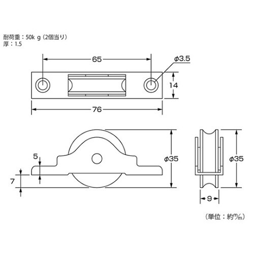 甲丸レールを走るい一般的な丸型の戸車です。 |