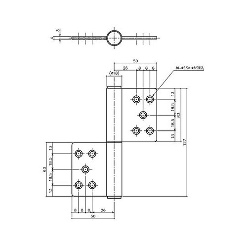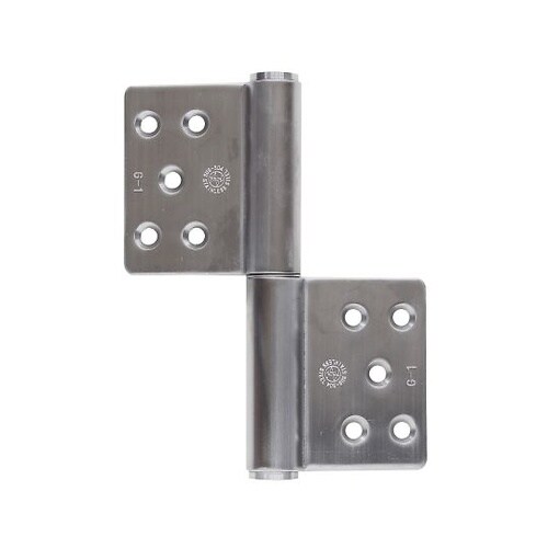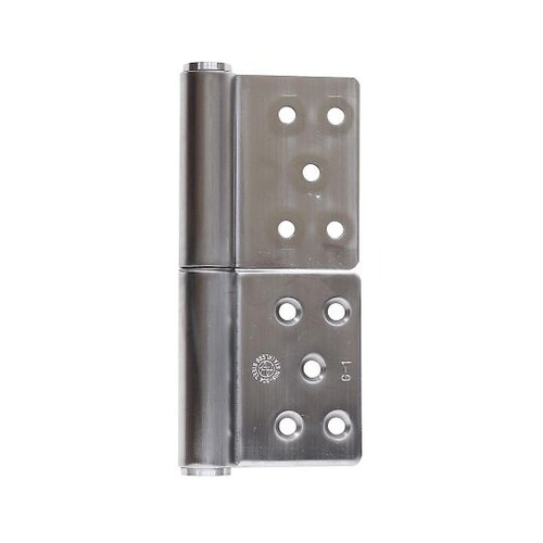 左勝手用の旗丁番です。室内物入等扉用取り付けの際、木部の割れやネジの破損を防ぐためキリで下穴を開けてください。 |