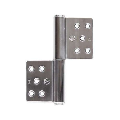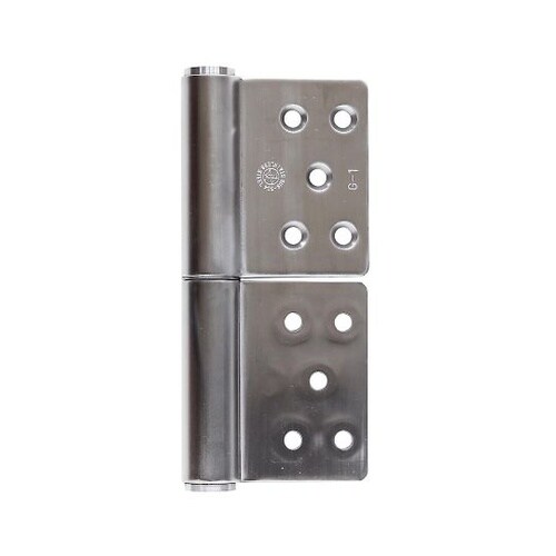 右勝手用の旗丁番です。室内物入等扉用取り付けの際、木部の割れやネジの破損を防ぐためキリで下穴を開けてください。 |