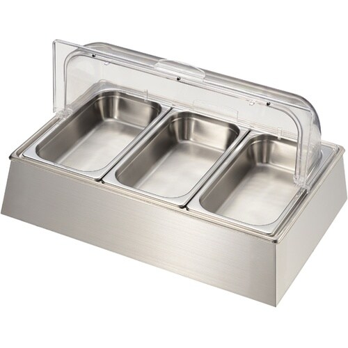 シック&冷たさが飛び切りの美味しさにシックで落ち着いた出で立ちが、サラダを最高なご馳走にコーディネイトします。ステンレスGNパン1/3×65mmを3枚使用 |