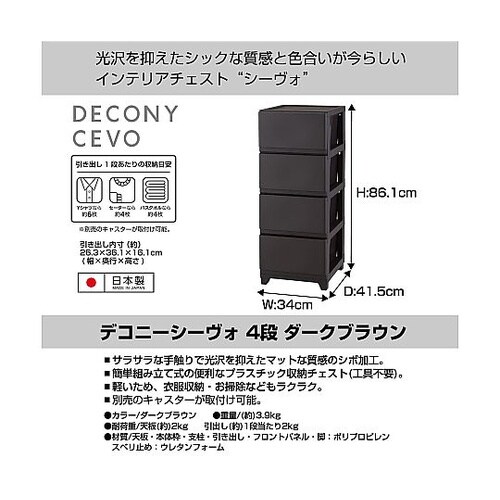 光沢を抑えたマットな質感とシックな色合いが今らしい、インテリアチェスト デコニー”シーヴォ”。光沢を抑えたマットな質感。引出し1段あたりYシャツなら約6枚、セーターなら約4枚、バスタオルなら約4枚収納 |