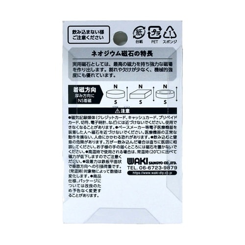 実用磁石の中で最高の磁力!強力な磁場を作り出します。割れや欠けが少なく、機械的強度にも優れています。磁気記憶媒体(クレジットカード、キャッシュカード、プリペイドカード、切符、電子時計、など)には近づけ