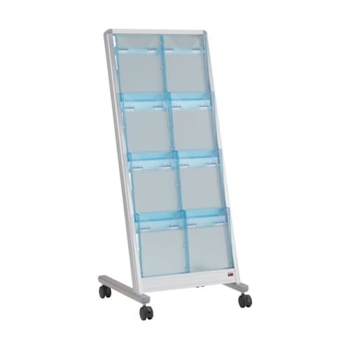 フレームはオールアルミ製で、防錆・防汚性能が高く、耐久性に優れています。パンフレットカセットは簡単に脱着可能です。キャスター付で簡単に移動できます。傾斜タイプは収納したパンフレットがほぼ全面見える設計 |