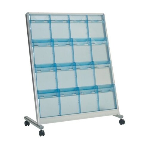 フレームはオールアルミ製で、防錆・防汚性能が高く、耐久性に優れています。パンフレットカセットは簡単に脱着可能です。キャスター付で簡単に移動できます。傾斜タイプは収納したパンフレットがほぼ全面見える設計 |
