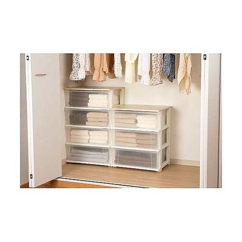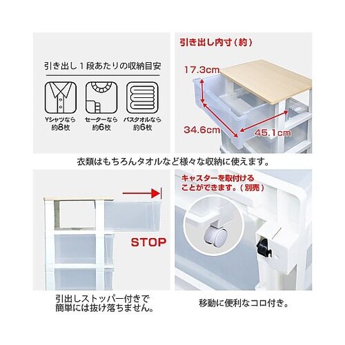 インテリアに溶け込み丈夫で傷付きにくい木製天板。移動に便利なコロ付。引出し1段あたりYシャツなら約8枚、セーターなら約6枚、バスタオルなら約6枚収納可能。 |