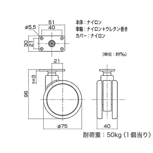 ハイロジック フレスコキャスター 75mm プレート・ストップ無 ブルー A055-5111