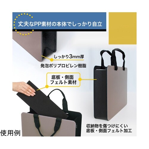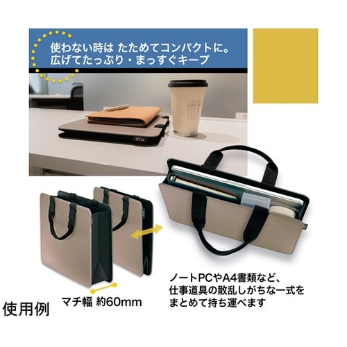 オフィス内の移動時や、リモートワーク時に散乱しがちな仕事道具一式をまとめて収納できる、持ち運びに便利なバッグ丈夫で軽い、厚みのある発泡PP素材を採用しっかりと自立するためロッカーやデスクで倒れにくく、