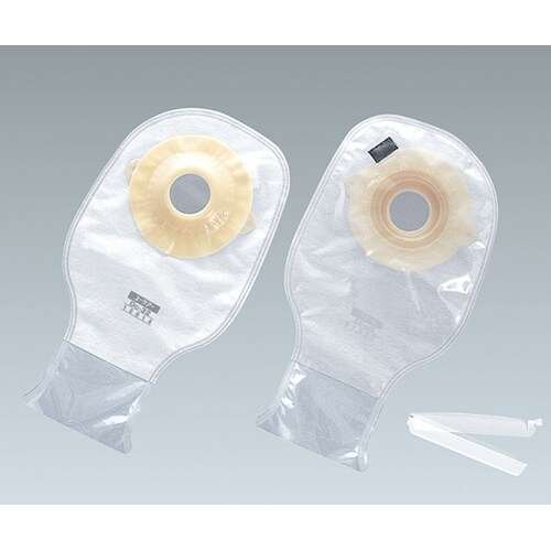 消化管ストーマ用。面板に硬い凸型のプレートが内蔵されており、高さのないストーマに適しています。下部に便排出口があるストーマ袋です。交換目安は2日。面板には、しなやかで耐久性のある薄型皮膚保護剤を使用し