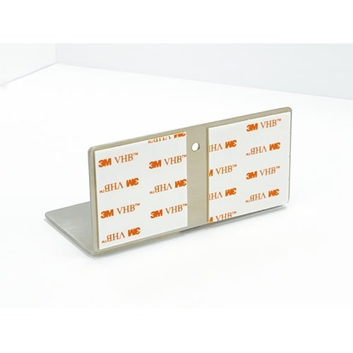 ステンレス製酸化を嫌う環境のキャビネット類を接着固定し転倒・移動防止半導体、研究所、製薬、食品加工職場の各種什器・機器の地震対策穴をあけない接着固定連結された2枚の接着パッド付き金具板(金具L)を床面 |