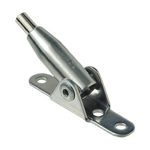 ボード等の側面にビス4本で固定します。180度回転するので、上面に取付けての傾斜吊りも可能です。ワイヤーは貫通し、位置調整が簡単に行えます。ワイヤーをピンから差し込むだけでしっかりと固定。パネルの吊り |