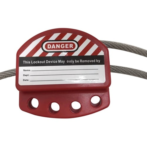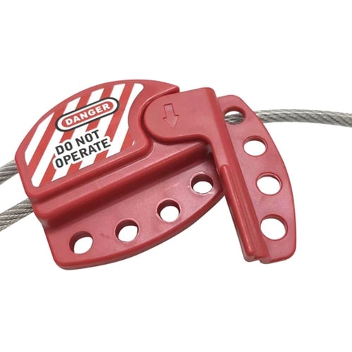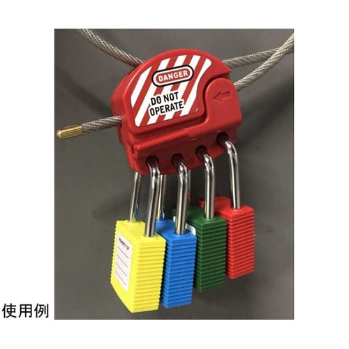 本体から伸びたケーブルをロックアウトする箇所に通し、本体矢印の方向にケーブルを通して締めると固定します。ハスプとしての機能も併せ持ち、最大4名のロックアウトが可能です。 |