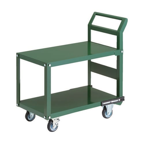 強靭な上段天板につき組み立て作業もでき、そのまま移動も可能です。上段荷台は取り外し可能です。作業から商品の一時保管、移動もできる2段型台車です。 |