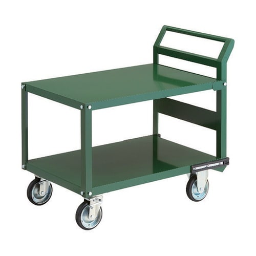 強靭な上段天板につき組み立て作業もでき、そのまま移動も可能です。上段荷台は取り外し可能です。作業から商品の一時保管、移動もできる2段型台車です。