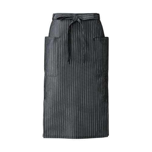 退色防止加工。使いやすい腰下エプロン、ミドル丈、ブラック×ストライプ色。 |