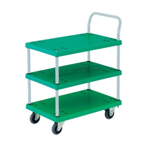 堅牢なリブ構造で耐久性に優れた樹脂台車です。再生ポリプロピレン樹脂を使用し環境に配慮した台車です。台車での小口荷物の集荷、配達用として便利です。タイヤ痕の付きにくいグレーゴムを使用しています。 |