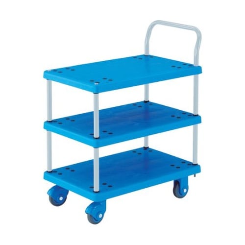 樹脂製省音キャスターの採用により走行音を抑えた静かな台車です。台車での小口荷物の集荷、配達用として便利です。早朝や夜間の作業、住宅地・事務所・店舗などでのご使用に大変便利です。