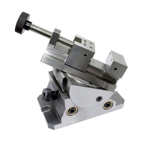 バイスを360度旋回、45度傾斜させることができるため複雑な切削・研削・彫刻加工などに活用できます。V溝付き口金のため、丸棒のクランプに便利です。 |
