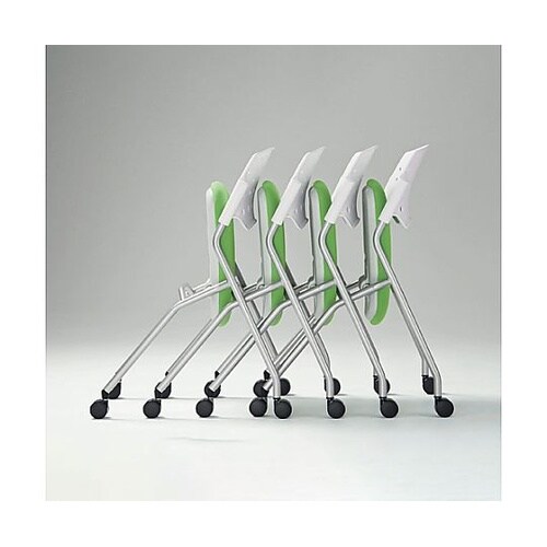 コンパクトサイズが使いやすいミーティング用チェアー座面の裏に手がかりをつけ、収納時に座を持上げやすくしています。カートのように重ねていけるスライドスタックを採用。省スペース収納が可能です。φ25.4m |