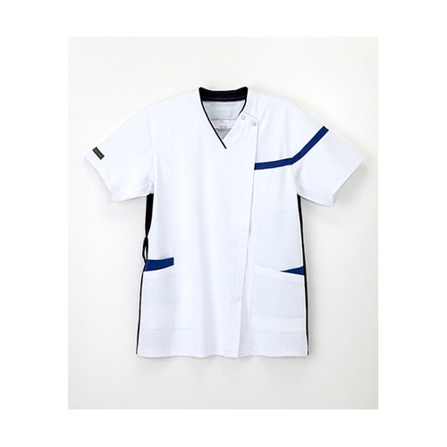 プロファンクション機能を搭載した男女兼用の前開きスクラブです。胸から袖に入ったラインはチームの結束を表現しています。また標識性を高めます。右腰のダブルポケットの内側はスマートフォンを収納できます。両脇
