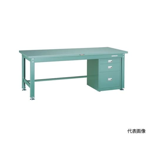 引出しが3段あるサイドキャビネット付です。サイドキャビネットにはキャスターがついています。耐久性に優れています。脚部はグリーン色です。スチール天板を使用し、汚れがひと拭きで取れ、割れや傷への耐久性に優 |