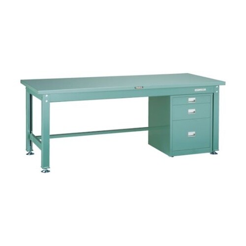 引出しが3段あるサイドキャビネット付です。サイドキャビネットにはキャスターがついています。耐久性に優れています。脚部はグリーン色です。スチール天板を使用し、汚れがひと拭きで取れ、割れや傷への耐久性に優 |