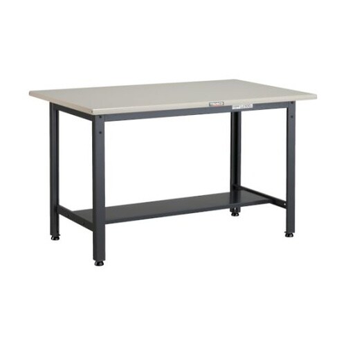 脚部はダークグレー色です。アジャスターとの交換により簡単にキャスター付にシステムアップが可能です。主要部溶接構造のノックダウン式です。中量作業台のスタンダードタイプです。 |